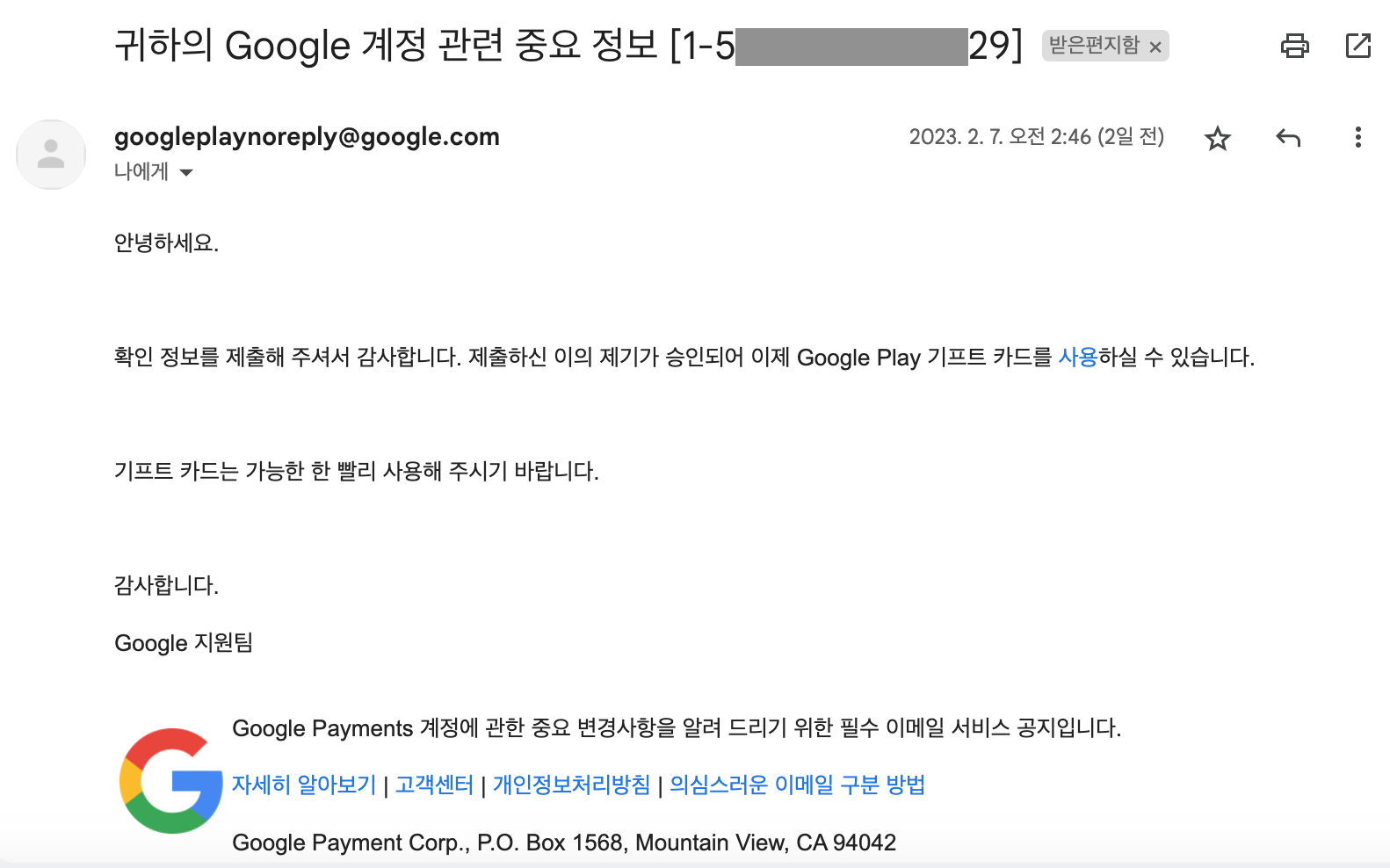 4. 구글 기프트 카드가 사용가능하다는 안내메일이 도착 (2023-02-07(화))