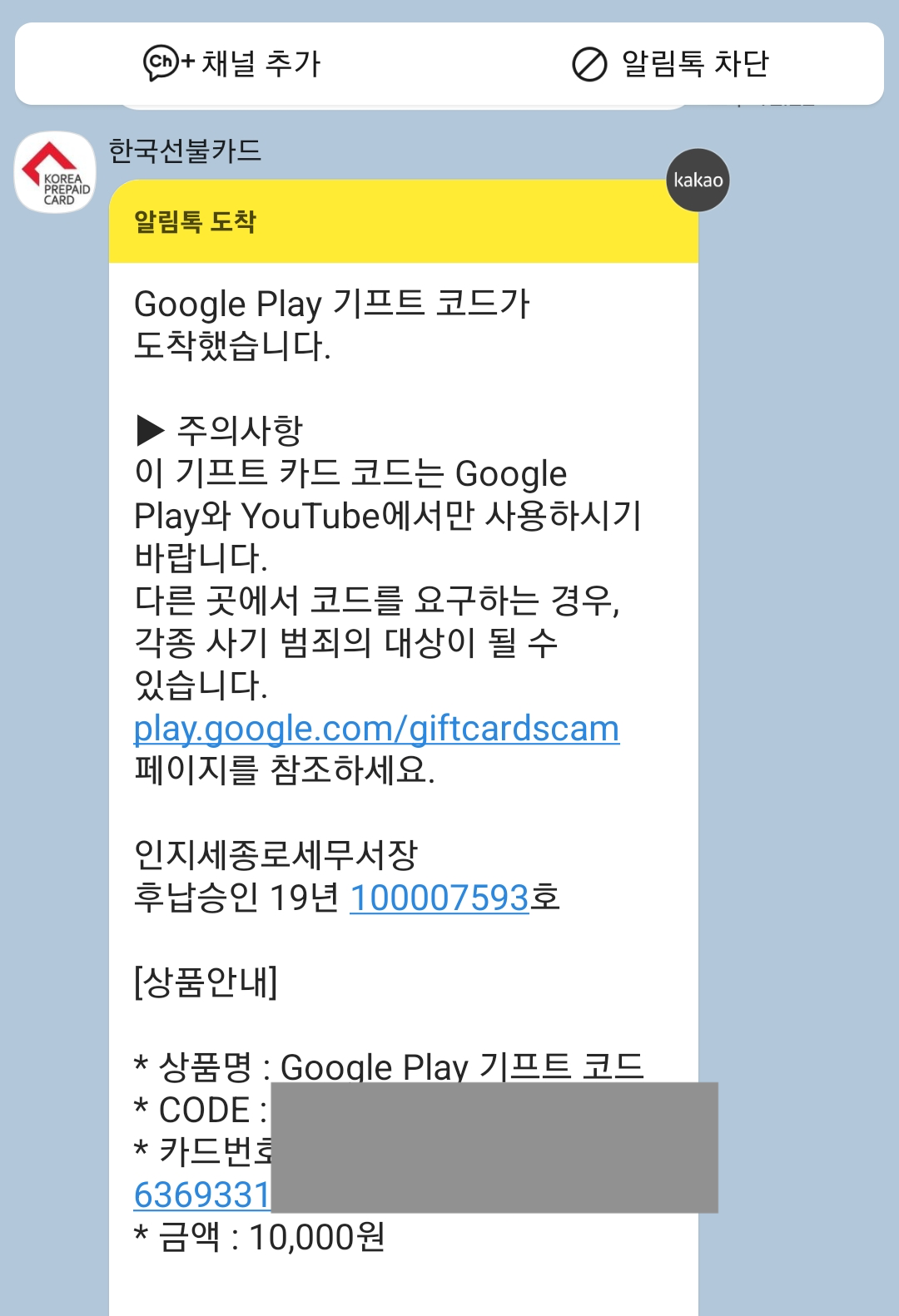 기프트 카드 코드가 확인가능한 카톡 캡쳐를 첨부했습니다.